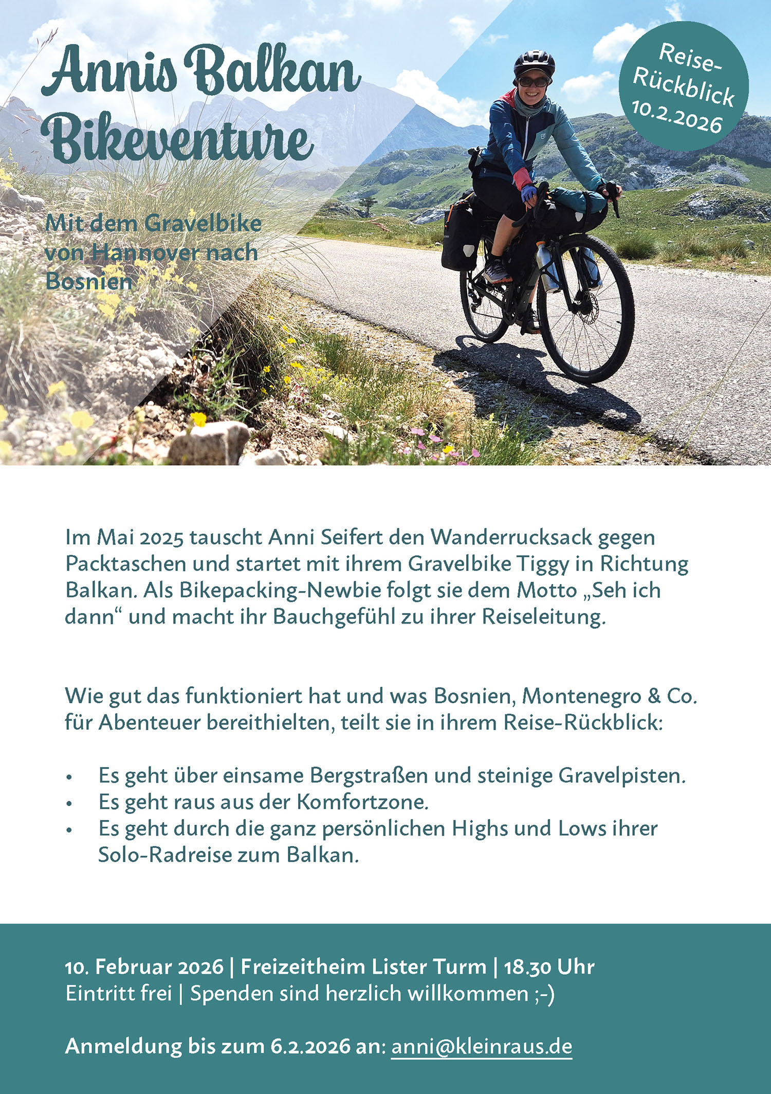 Annis Balkan Bikeventure - Radreisevortrag am 10.02.26 ab 18:30 im Stadtteilzentrum Lister Turm, Hannover. Der Eintritt ist frei, die Spendendose darf gefüttert werden. Bitte anmelden.