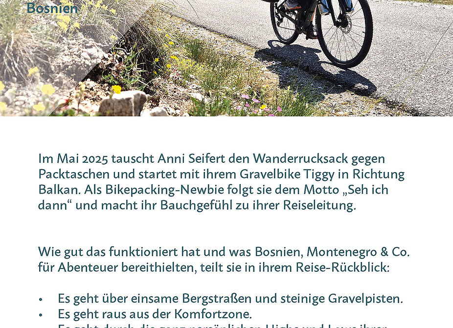 Im Mai 2025 tauscht Anni Seifert den Wanderrucksack gegen Packtaschen und startet mit ihrem Gravelbike Tiggy in Richtung Balkan. Als Bikepacking-Newbie folgt sie dem Motto „Seh ich dann“ und macht ihr Bauchgefühl zu ihrer Reiseleitung. Wie gut das funktioniert hat und was Bosnien, Montenegro & Co. für Abenteuer bereithielten, teilt sie in ihrem Reise-Rückblick: