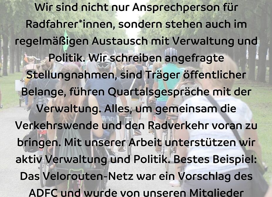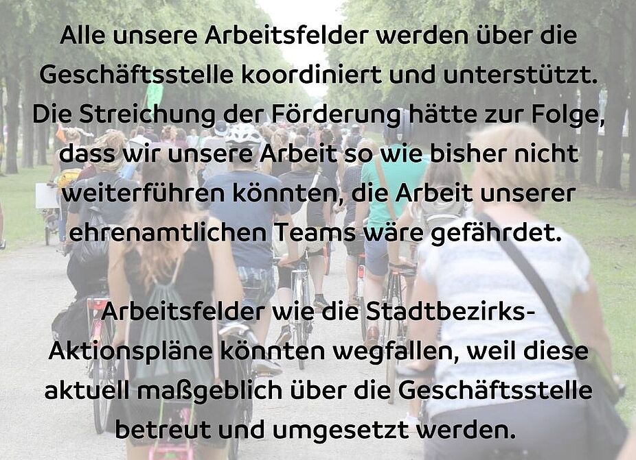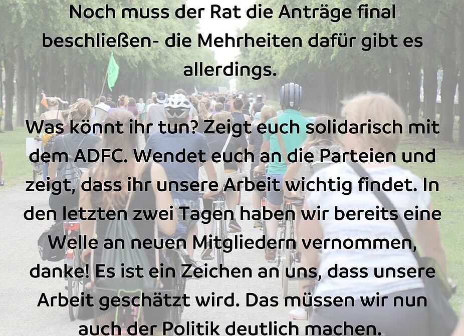 In 7 Tafeln schildern wir kurz was die Streichung der ADFC-Förderung bedeutet. Und wir bedanken uns für die vielen Solidaritätsbekundungen und den vielen Neu-Mitgliedern. Wir werden uns weiterhin für den Radverkehr und der Verbesserung einsetzen.